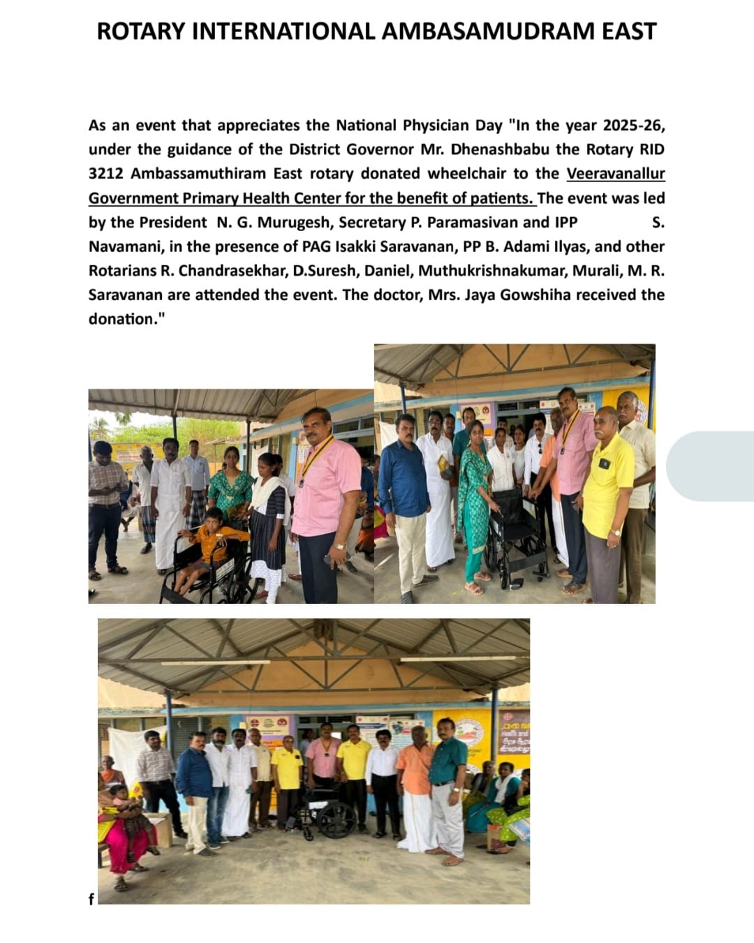 Wheel chair donation for patients at Govt Hospital, Veeravanallur. As an event that appreciates the National Physician Day "In the year 2025-26, under the guidance of the District Governor Mr. Dhenashbabu the RID